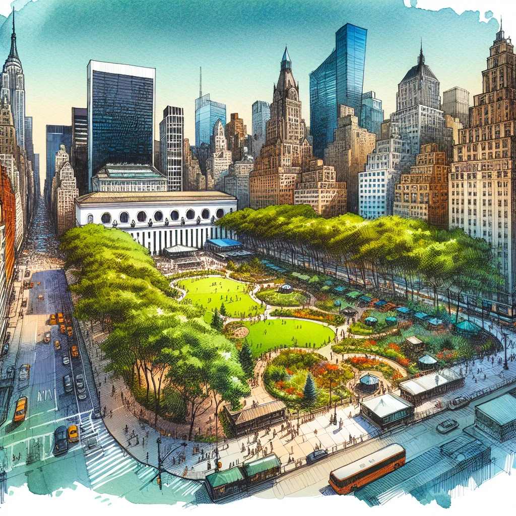 Bryant Park ist eine grüne Oase im Herzen von Manhattan, New York City, und gilt als einer der schönsten und lebhaftesten Parks der Stadt. Der Park erstreckt sich über 9,6 Hektar und liegt zwischen der 40. und 42. Straße sowie der Sixth und der Seventh Avenue. Er ist nicht nur ein beliebter Rückzugsort für Einheimische und Touristen, sondern auch ein wichtiger kultureller und gesellschaftlicher Treffpunkt.