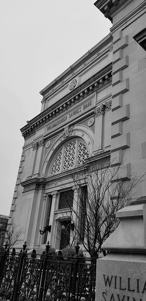 Fassade: Die Fassade ist mit prächtigen Sandsteinen verkleidet und wird von großen, hohen Fenstern dominiert, die mit kunstvollen Verzierungen versehen sind. Die markante Kuppel, die das Gebäude krönt, ist ein bemerkenswertes Merkmal und verleiht der Bank eine unverwechselbare Silhouette, die in der Skyline von Williamsburg heraussticht.